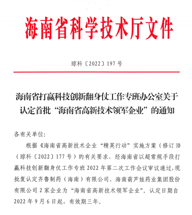 近日,海南省科学技术厅发布的《海南省打赢科技创新翻身仗工作专班办公室关于认定首批“海南省高新技术领军企业”的通知》中显示,批复认定海南G22恒峰药业集团股份有限公司等2家企业为“海南省高新技术领军企业”。认定日期自2022年9月6日起,有效期三年。
