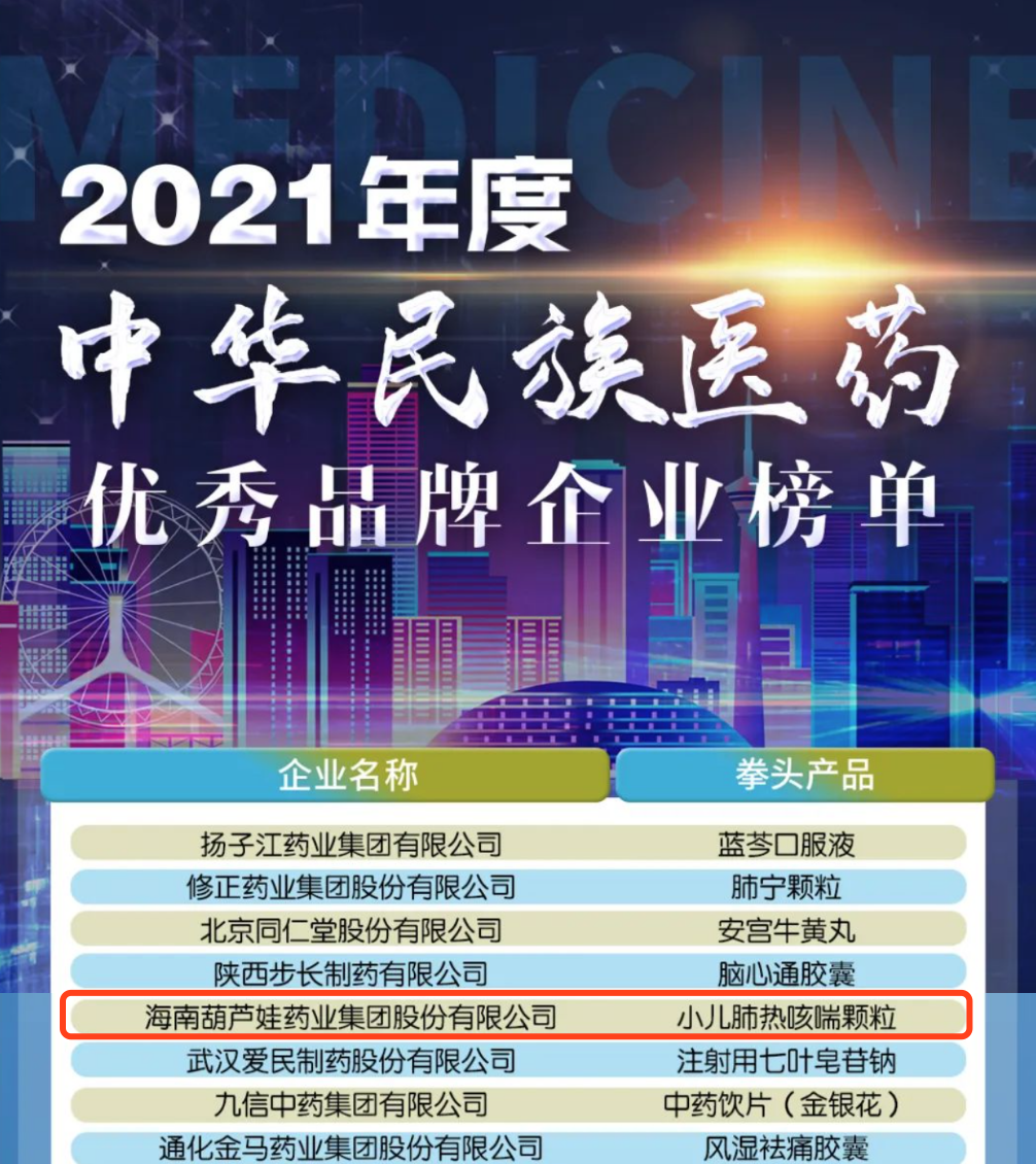 12月29日,全国工商联医药业商会发布了“2021年度中华民族医药优秀品牌企业榜单”,G22恒峰药业集团凭借黄金单品小儿肺热咳喘颗粒(4克)实力登榜。