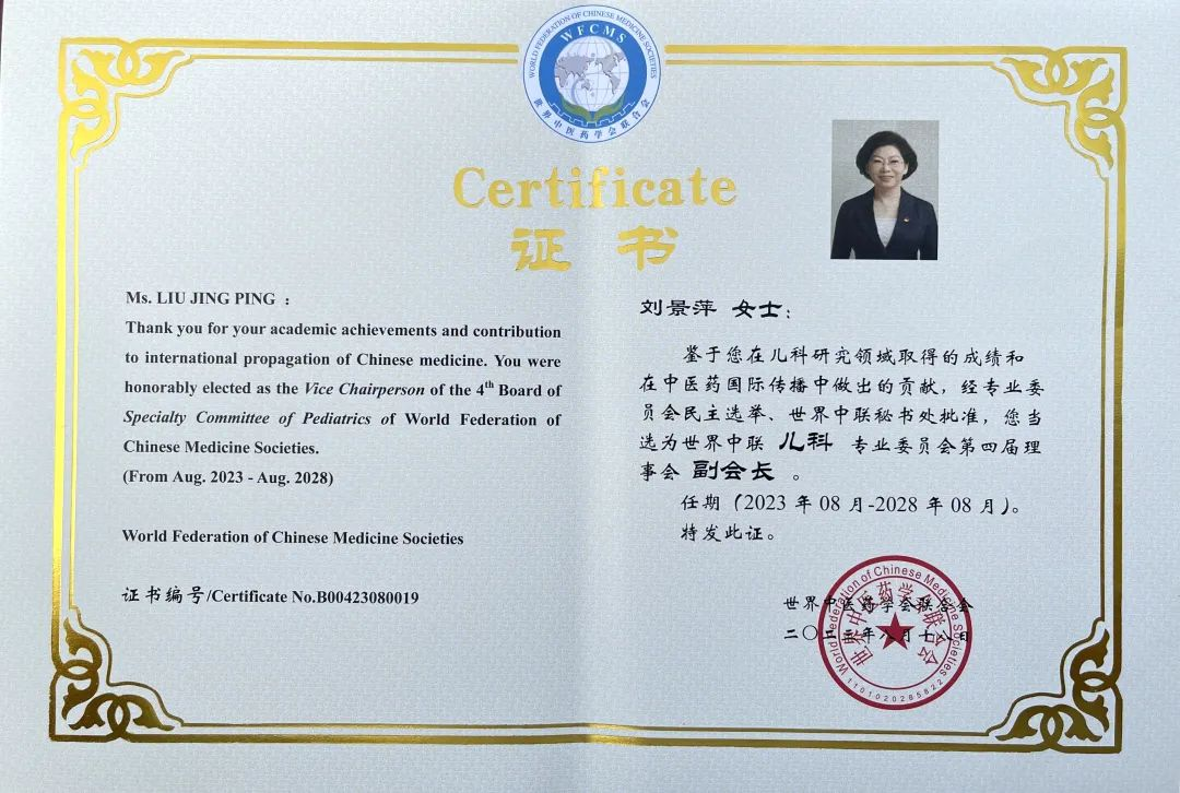 G22恒峰药业集团党委书记、董事长刘景萍当选世界中医药学会联合会儿科专业委员会第四届理事会副会长